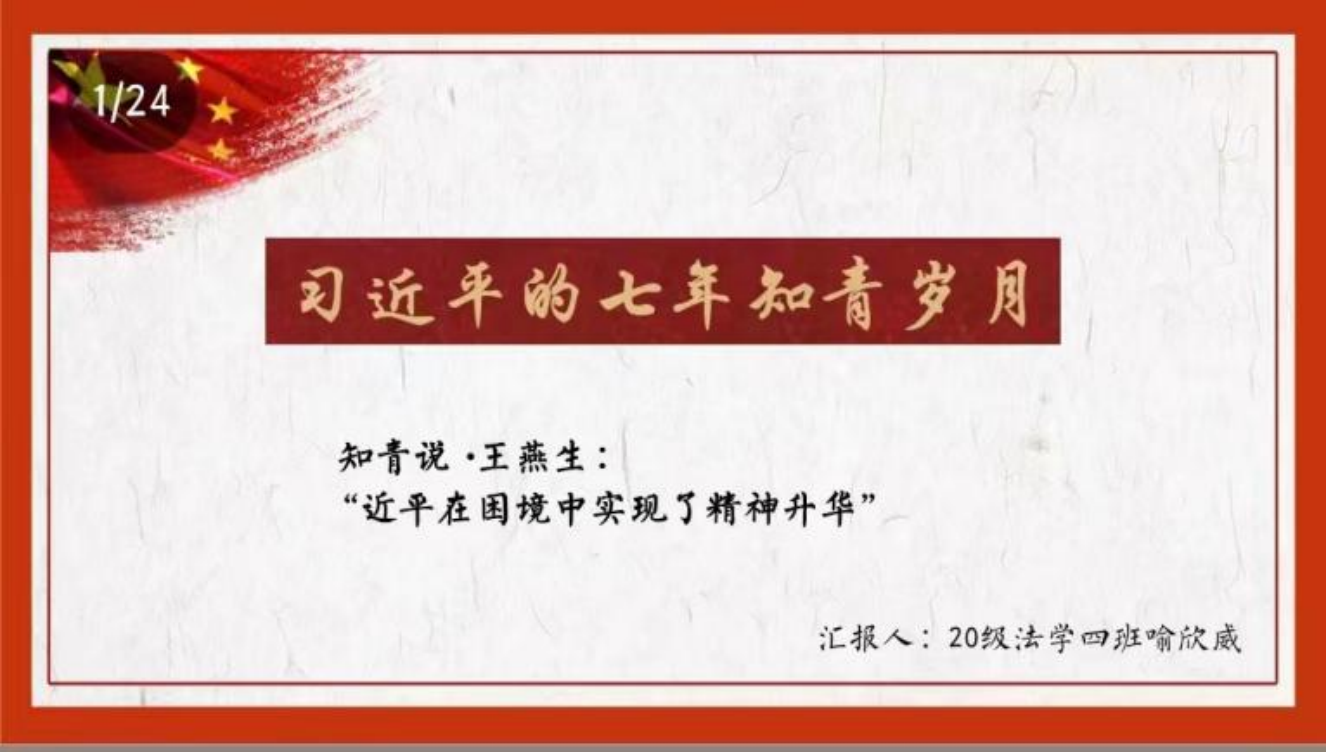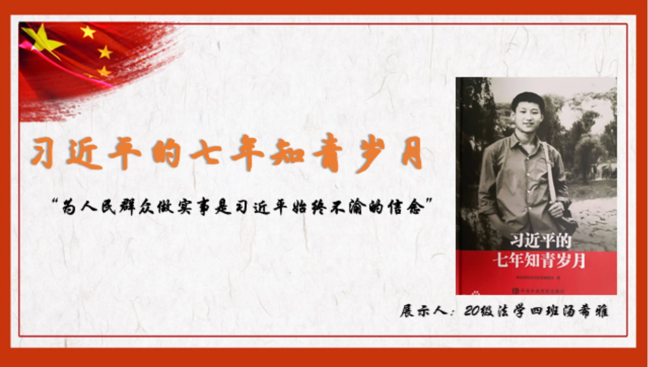 活动的第一部分为《习近平的七年知青岁月》读书分享,支部特意邀请黄杰、李峥、汤希雅、喻欣威四名发展对象参与此次活动,进行展示分享。四位汇报人以书中“知青说”部分中雷榕生和雷平生两兄弟、陶海粟、王燕生等采访作为切入点,对书中第一章的内容进行了详细的解读,介绍了习近平同志“始终不渝坚持为人民群众做实事的信念”,带领大家感受领悟青年习近平的担当和作为。