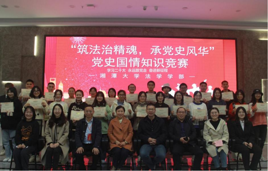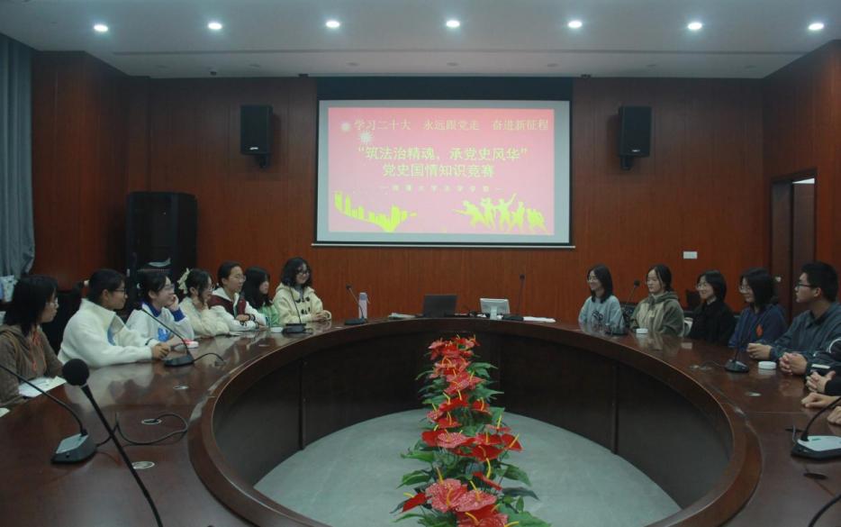 砥砺奋进守初心,青春献礼二十大。2022年11月15日下午,法学学部组织开展党史国情法治知识竞赛活动。法学院党委陈双喜书记、知识产权学院直属党支部田良富书记、信用风险管理学院直属党支部易立峰书记、法学院党委黎益君副书记、22级年级辅导员王惟郅老师、学工办江冰洁老师出席了本次活动。6支参赛队伍共24名选手、学生党员代表、近70名观赛同学参与其中。