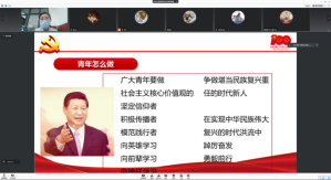 会议伊始,全体参会党员认真观看了习近平总书记在中国人民大学考察时的部分视频,视频简要介绍了习近平总书记在中国人民大学的考察过程以及其在考察中的讲话内容。视频中,习总书记寄语广大青年要做社会主义核心价值观的坚定信仰者、积极传播者、模范践行者,向英雄学习、向前辈学习、向榜样学习,争做堪当民族复兴重任的时代新人,在实现中华民族伟大复兴的时代洪流中踔厉奋发、勇毅前进。