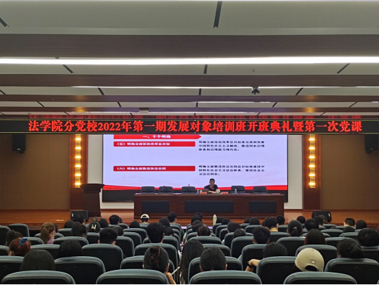2022年4月26日晚上,法学院、知识产权学院、信用风险管理学院分党校在法学楼学术报告厅举行了2022年第1期发展对象培训班开班典礼暨第一次专题讲座,法学院党委书记陈双喜为大家授课。法学院党委副书记李锋、组织员老师黄彬出席开班典礼。204名发展对象参加了此次培训。