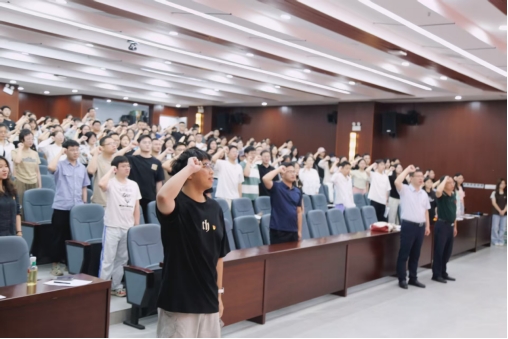 大会在庄严肃穆的国际歌歌声中拉开序幕。法学学部党委书记陈双喜带领全体党员重温入党誓词。面对鲜红的党旗,毕业生党员们庄严举起右手握拳宣誓。临近毕业这一人生重要节点,重温誓词让他们铭记入党初心,坚定为实现民族复兴伟业贡献智慧和力量的决心。