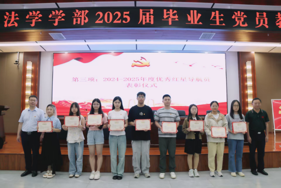 会上对2024 - 2025年度优秀红旗导航员进行了表彰仪式。红星导航员是法学学部党委精心打造的一项特色党建品牌活动,通过严格选派高年级优秀学生党员,与新生班级及寝室结对帮扶,充分发挥高年级学生党员“传帮带”的示范引领作用。多年来,该活动在促进新生养成教育、加强党建带团建等方面成效显著,为学部人才培养和党建工作注入了源源不断的活力。