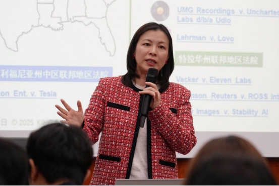 讲座伊始,宋海燕围绕AIGC的可版权性问题展开深入探讨。她指出,著作权法对“受版权保护作品”的要求为独创性、可复制性(可固定)以及作为人类智慧结晶三大要素。宋海燕律师详细分析了AI自动生成内容与AI辅助生成内容的区别,并结合经典案例详细分析了人类在创作过程中的参与程度对版权认定的影响。她强调,AI辅助生成内容中,人类的“创作性控制(Creative control)”是版权保护的关键。